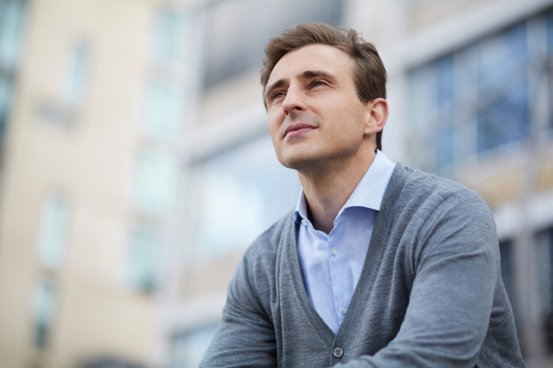 Dieses Porträt zeigt einen Moment der Ruhe und des gedanklichen Weitblicks. Der Mann schaut leicht nach oben, als würde er gedanklich ein Ziel oder eine Idee visualisieren. Sein Gesichtsausdruck ist ruhig, konzentriert, mit einem Hauch von Zuversicht. Der Blick geht klar und wach in die Ferne.