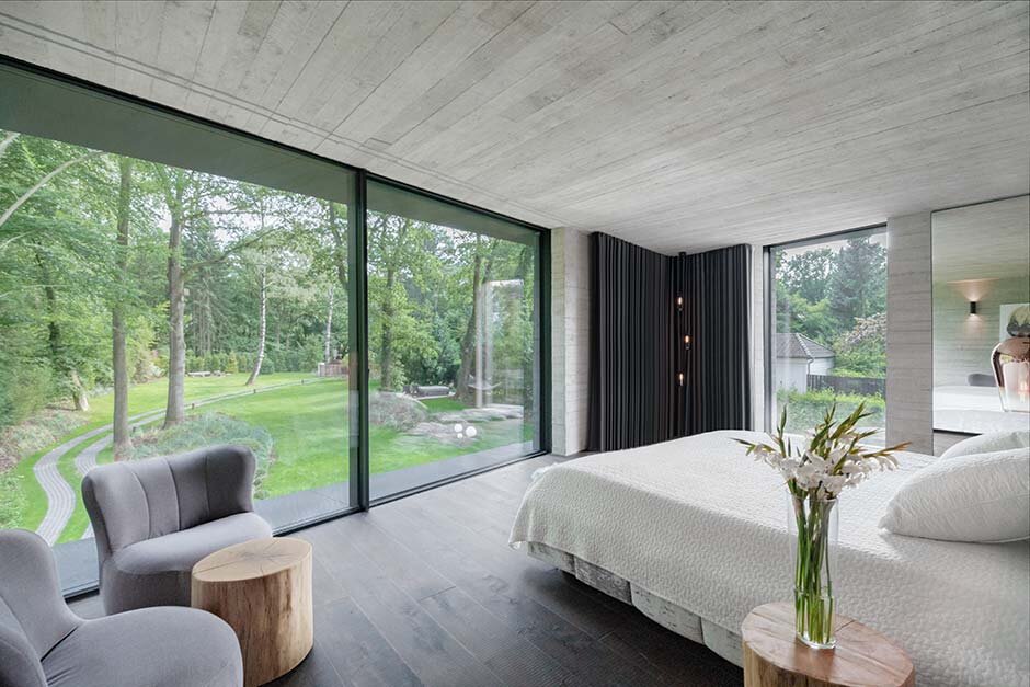 Innenarchitektur Villa Neo mit Panoramafenstern, Sichtbeton und V-Stützen von Querkopf Architekten, fotografiert von Frank Löschke