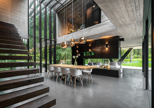 Innenraum der Villa Neo mit Holztreppe Essbereich Glasfassade und Galerie moderner Sichtbetonbau bei Hamburg fotografiert von Frank Löschke. Innenaufnahme der Villa Neo mit Blick auf Treppe, Essbereich und Wohnzone. Links die freitragende Treppe aus dunklem Holz vor Sichtbetonwand, rechts der lange Esstisch mit Designerstühlen unter goldfarbenen Pendelleuchten. Die raumhohe Glasfassade bringt viel Tageslicht in den offenen Grundriss. Im Hintergrund verbindet eine Galerie die beiden Geschosse. Die Architektur kombiniert Sichtbeton, Glas, Stahl und Licht zu einem präzise komponierten Wohnkonzept.