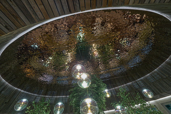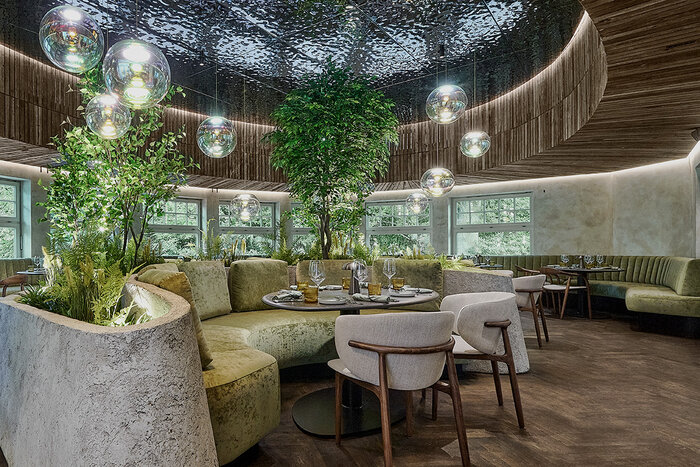 Die Räume wirken offen, organisch und zugleich geschützt. Weiche Linien und natürliche Materialien prägen das Konzept. Samtbezogene Sitzlandschaften in sanften Grüntönen, runde Tische, lebendige Pflanzeninseln und schwebende Glaskugelleuchten schaffen ein Ambiente, das Ruhe und Exklusivität zugleich vermittelt. Der dunkle Holzboden und die elegante Deckenstruktur fügen sich nahtlos in das Konzept ein und verleihen dem Raum eine warme Tiefe.