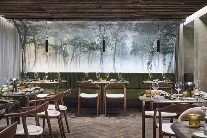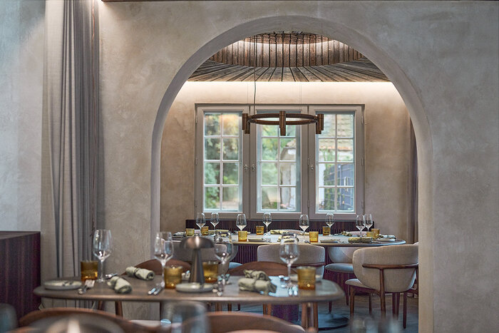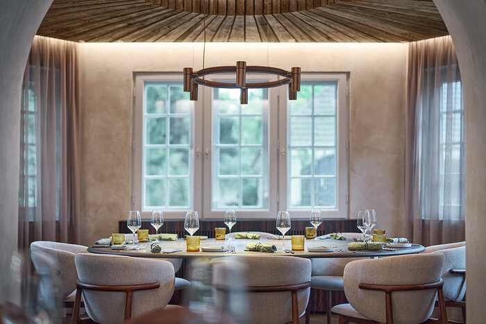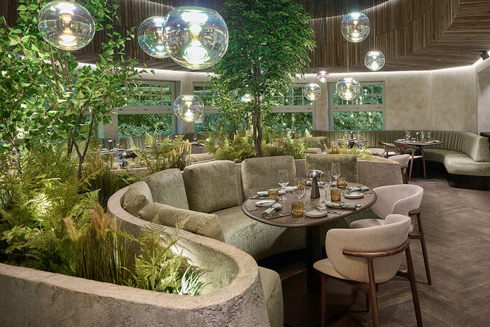 Durch die großen Fenster fällt Tageslicht auf sanft strukturierte Wände und üppiges Grün. Abends verwandelt die Lichtgestaltung den Raum in eine atmosphärische Oase, die perfekt mit dem kulinarischen Konzept harmoniert. Architektur, Natur und Gastronomie werden hier zu einer erlebbaren Einheit.
